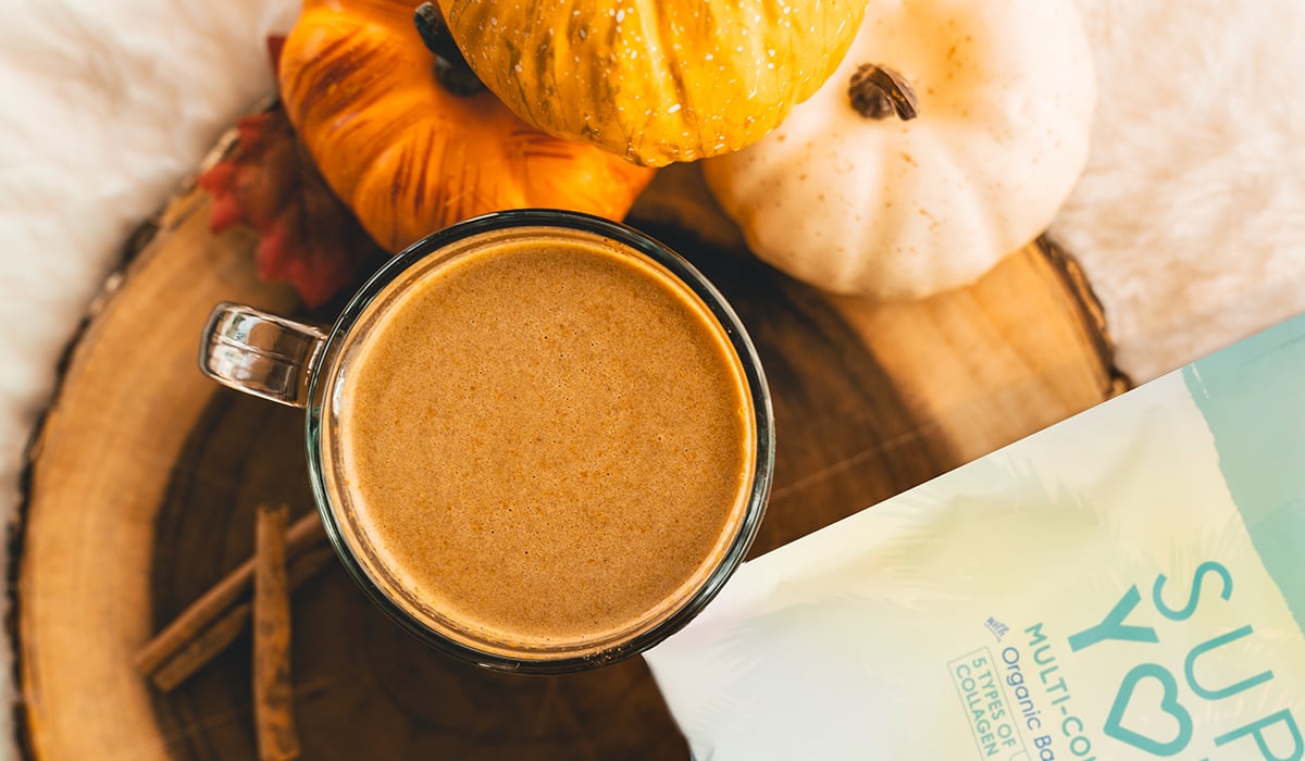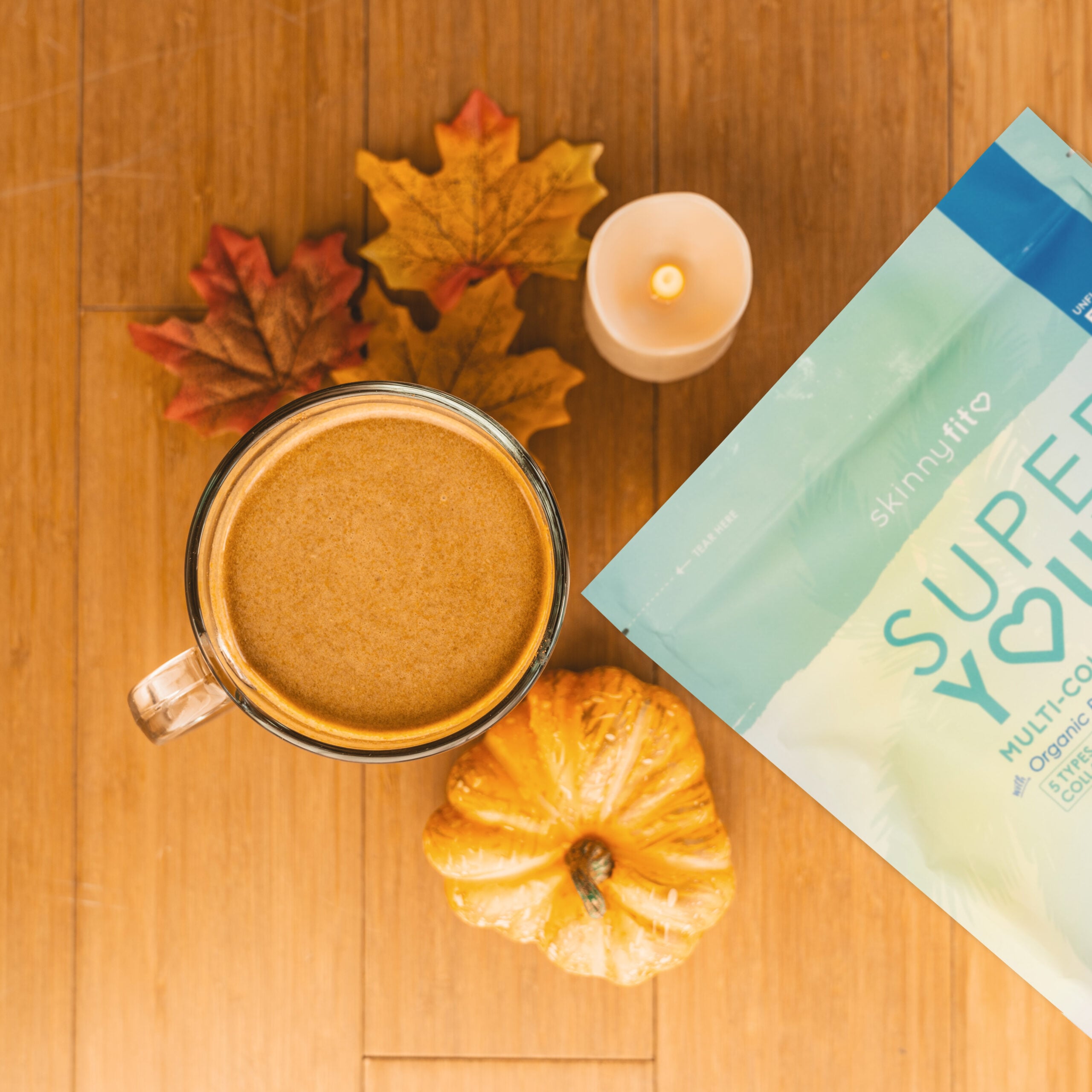 Unlike the traditional PSL, the healthy pumpkin spice latte contains 8g of protein from SkinnyFit Super Youth! The added protein helps you feel fuller for longer and keeps you satisfied between meals, making your weight loss journey even easier. Super Youth is actually a blend of five different types of collagen peptides—and if you didn’t already know, collagen is uh-maze-ing for your skin, hair, and nails! So, seriously, what’s not to love about this skinny pumpkin spice latte recipe? The answer my friends is nothing! 🍂 ☕️